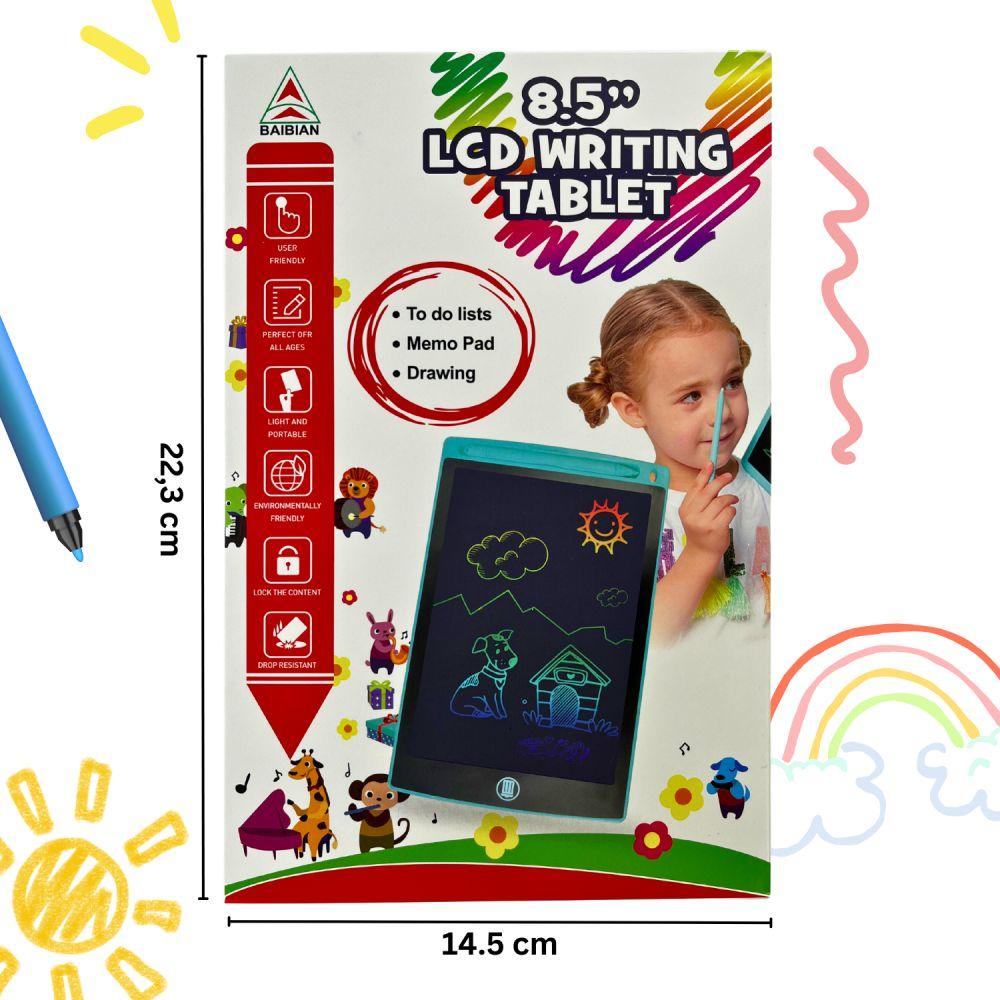 لوح الكتابة الملون مقاس 8.5 انش، خفيف وسهل الحمل ويمكن وضعه بسهولة في شنطة المدرسة أو حقيبة اليد. ويتميز اللوح بتقنية حساسة للضغط، فباستخدام القلم المرفق يمكن لطفلك الرسم والكتابة بسهولة، وستظهر الخطوط بألوان متعددة مبهجة للعين بلا شعاع أو وهج يؤذي العين مما يجعل هذا اللوح آمن على البصر حتى عند استخدامه لفترات طويلة. هذا المنتج يقلل من استخدام الورق، مما يجعله منتج صديق للبيئة.